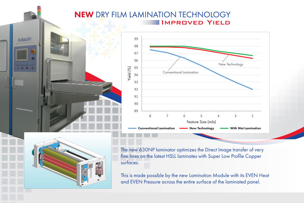 Fred Long, Matrix Business Development says: “The new Mach 630NP Series machines address the accuracy needed to assist in the Direct Image (DI) transfer of very fine lines on the latest HSLL laminates using Super Low Profile Copper surfaces. This is made possible by the new Lamination Module with its EVEN Heat and EVEN Pressure across the entire surface of the laminated panel. In addition, the ability to change the rubber lamination rolls in seconds will not only increase productivity but will also offer alternative “quick change” rubber solutions for different product needs. The complete redesign of the film lamination approach will now begin to reach the most important users of this latest technology. Matrix is eager to show manufacturers that by using the new system, Productivity and Yield will now surpass all traditional ROI expectations.